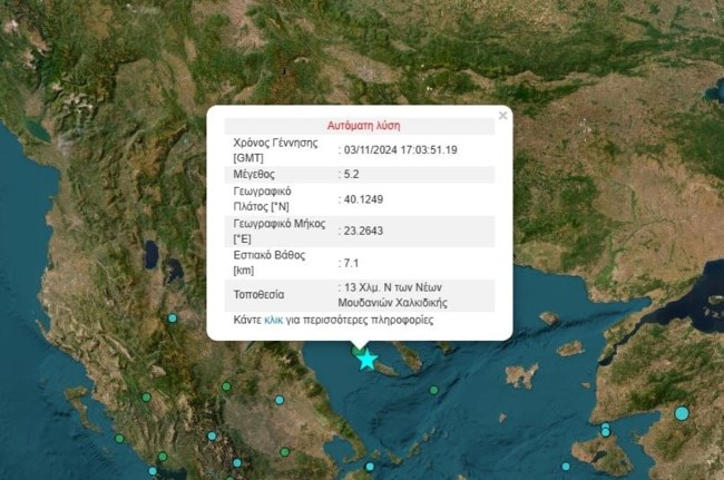 Σεισμός 5,2 Ρίχτερ σημειώθηκε το απόγευμα της Κυριακής (3/11) στη Χαλκιδική.