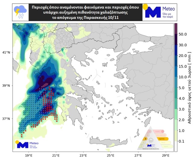 Στους χάρτες που ακολουθούν παρουσιάζεται ο υετός που αναμένεται το απόγευμα και τις πρώτες βραδινές ώρες της Παρασκευής 10/11 καθώς και οι περιοχές με αυξημένη πιθανότητα χαλαζόπτωσης. Με μαύρες και λευκές κουκίδες σημειώνονται οι περιοχές με αυξημένη πιθανότητα χαλαζόπτωσης με χαλάζι μικρού μεγέθους ενώ με κόκκινα τρίγωνα σημειώνονται οι περιοχές με αυξημένη πιθανότητα χαλαζόπτωσης με χαλάζι μεγαλύτερου μεγέθους.