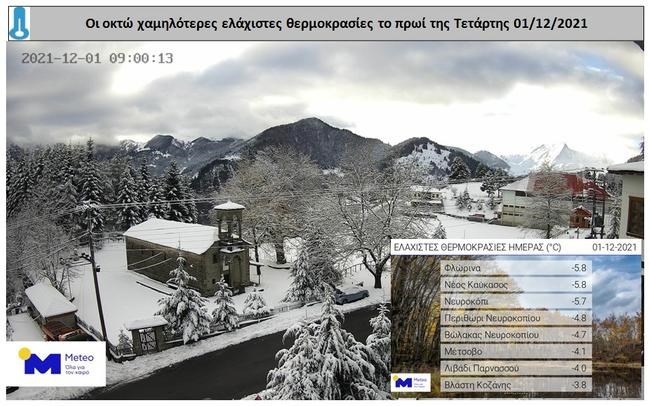 Σύμφωνα με το δίκτυο των αυτόματων μετεωρολογικών σταθμών του Εθνικού Αστεροσκοπείου Αθηνών/meteo.gr, οι χαμηλότερες ελάχιστες θερμοκρασίες καταγράφηκαν σε Φλώρινα (-5,8), Νέο Καύκασο Φλώρινας (-5,8), Νευροκόπι (-5,7), Περιθώριο Νευροκοπίου (-4,8), Βώλακα Νευροκοπίου (-4,7), Μέτσοβο (-4,1), Λιβάδι Παρνασσού (-4,0) και Βλάστη Κοζάνης (-3,8 βαθμοί).