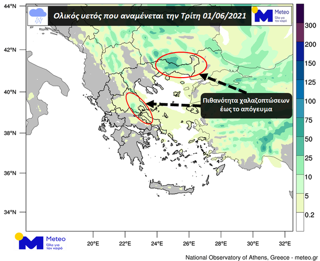 Για το υπόλοιπο της ημέρας, σύμφωνα με τα διαθέσιμα προγνωστικά στοιχεία του Εθνικού Αστεροσκοπείου Αθηνών/meteo.gr, τοπικές βροχές και σποραδικές καταιγίδες αναμένονται σε Θράκη, Μακεδονία, Θεσσαλία, Στερεά Ελλάδα, Βορειοανατολική Πελοπόννησο και Βόρειο Αιγαίο.
