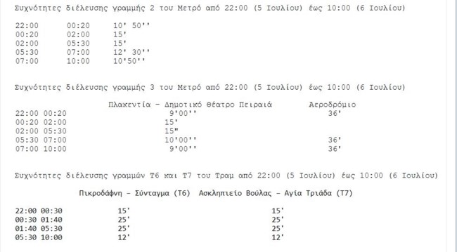 Η πιλοτική 24ωρη λειτουργία μέσων σταθερής τροχιάς την 5η Ιουλίου αφορά τις γραμμές 2 και 3 του Μετρό και τις γραμμές Τ6 και Τ7 του Τραμ.