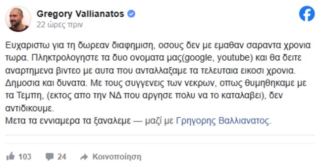 Υπενθυμίζεται ότι ο μετά τον θάνατο του Αλέξη Κούγια, ο Γρηγόρης Βαλλιανάτος προχώρησε σε μία ανάρτηση στο Facebook, η οποία προκάλεσε ενόχληση στον γιο του γνωστού ποινικολόγου. Αν και δεν ανέφερε κάποιον ονομαστικά, ο κ. Βαλλιανάτος έγραψε: