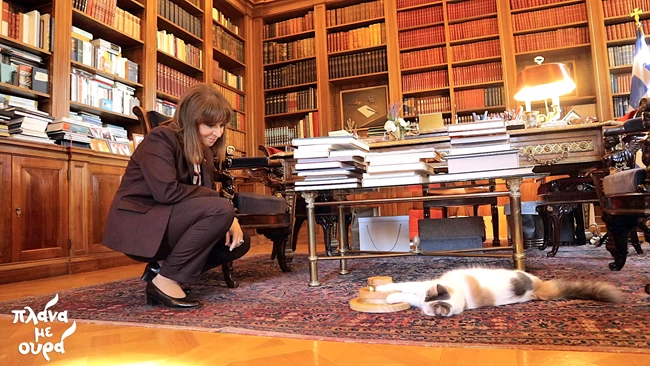 ΠΡΟΕΔΡΟΣ ΤΗΣ ΔΗΜΟΚΡΑΤΙΑΣ: Σχεδόν τυχαία, γιατί πάντα είχα, είχαμε γατιά. Και επειδή όλα τα ζώα, αγαπώ τους σκύλους και με συγκινούν, αλλά φαίνεται είμαι από τους ανθρώπους που με συγκινούν ιδιαίτερα οι γάτες. Και αυτό καμία φορά έχει να κάνει και με την απασχόληση καθενός. Ιδίως στους συγγραφείς, επειδή έχουν αυτή τη ζωή που δεν είναι τόσο εξωστρεφής, δεν έχει τόση κινητικότητα, πάντα τους συντροφεύει μια γάτα. Και εγώ θυμάμαι τον εαυτό μου, πολλά χρόνια στο δικαστήριο, έτσι, έχω συνδέσει κιόλα με την παρουσία, τότε είχαμε άλλες δύο γάτες στο σπίτι, την παρουσία τους στο γραφείο παράλληλα την ώρα που έγραφα σχέδια αποφάσεων. Όταν λοιπόν ήρθα εδώ, ακριβώς επειδή ο χώρος του Μεγάρου είναι ένας μνημειακός χώρος, θέλει μεγάλη προσοχή, ήμουν πολύ προβληματισμένη και είχα πει στην αρχή ότι δεν θα έχουμε ζωάκι εδώ. Ταξιδέψαμε όμως στην Κάρπαθο τυχαία και γνωρίστηκα με δύο κυρίες που έχουν ένα σωματείο φιλοζωικό της Καρπάθου. Και ήρθαν λοιπόν και εμφανίστηκαν με την Καλυψώ πολύ μικρή, είχε γεννηθεί πριν δύο μέρες, την είχαν βρει, ήταν η μία κυρία με τον σύζυγό της, είχαν βγει βόλτα, περίπατο στο βουνό και άκουσαν το γατάκι να φωνάζει μέσα στα θάμνα και την έσωσαν και την έφεραν να τη δούμε. Έτσι γνωρίσαμε λοιπόν τη μικρή Καλυψώ, αλλά μας μπήκε η ιδέα και υπέκυψα. Και μετά από έναν μήνα, αφού λίγο ξεπετάχθηκε και έκανε τα εμβόλιά της, ήρθε εδώ. Οφείλω να πω ότι ήταν και πολύ σημαντική η παρουσία της συντροφιάς στην πανδημία. Γιατί όσο να είναι, όλοι ζήσαμε περισσότερο μοναχικά αυτή την περίοδο.