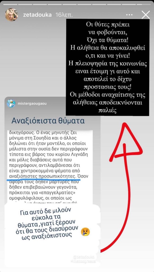 Η Ζέτα Δούκα σχολιάζει με τη σειρά της: "Η αλήθεια θα αποκαλυφθεί ό,τι και να γίνει! Η πλειοψηφία της κοινωνίας είναι έτοιμη γι’ αυτό και αποτελεί το δίχτυ προστασίας τους! Οι μέθοδοι αναχαίτισης της αλήθειας αποδεικνύονται παλιές”.