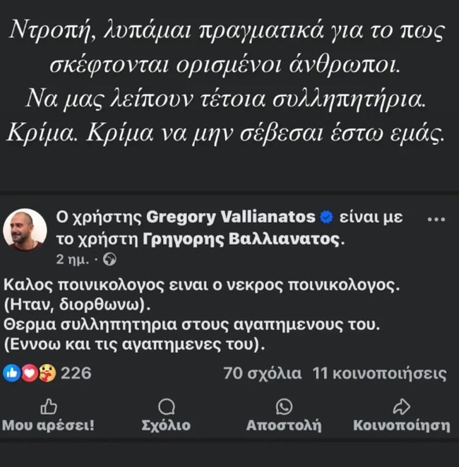 Η προσβλητική ανάρτηση του Γρηγόρη Βαλλιανάτου για τον Αλέξη Κούγια προκάλεσε την οργισμένη αντίδραση του γιου του γνωστού ποινικολόγου.