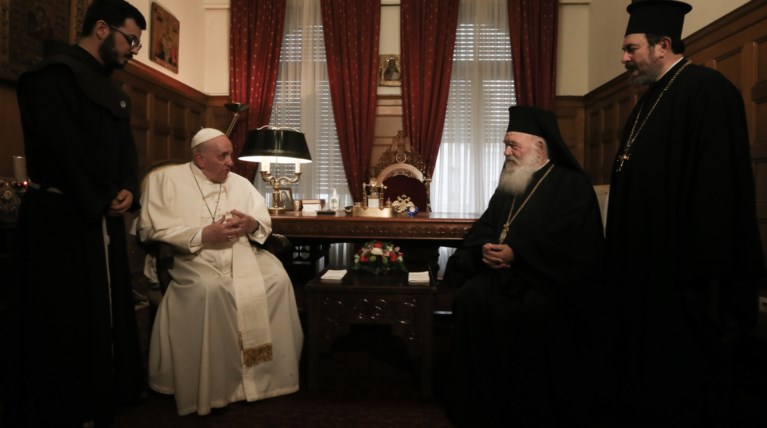 Ο Μακαριώτατος τον καλωσόρισε και του ευχήθηκε καλή επιτυχία στους στόχους του ταξιδιού του και η ατμόσφαιρα της Ελλάδας να του δώσει δύναμη. Από την πλευρά του, ο Πάπας Φραγκίσκος εξέφρασε τη χαρά του για τη συνάντηση αυτή, ενώ τόνισε ότι θυμάται και την πρώτη τους συνάντηση στη Λέσβο.