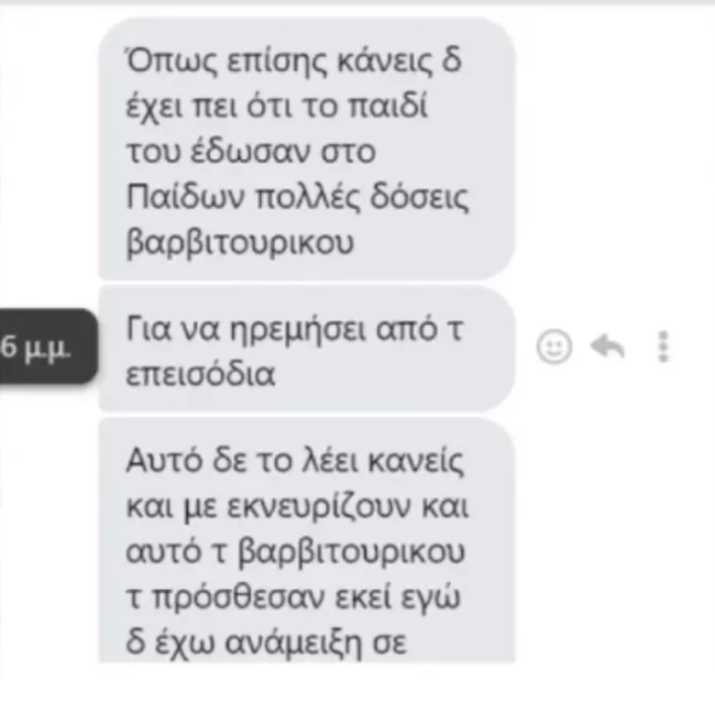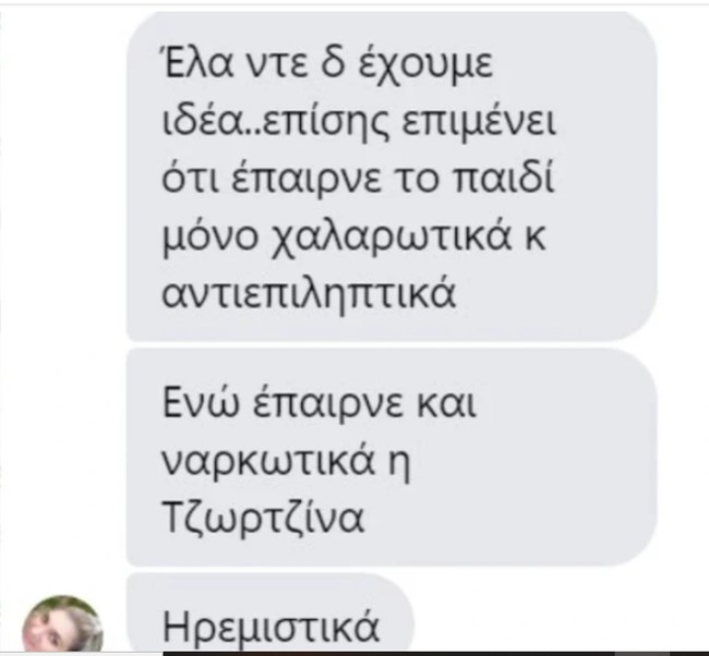 "Επιμένουν ότι το παιδί έπαιρνε μόνο χαλαρωτικά και αντιεπιληπτικά, ενώ έπαιρνε και ηρεμιστικά η Τζωρτζίνα. Κανείς δεν έχει πει ότι του παιδιού του έδωσα στο Παίδων πολλές δόσεις βαρβιτουρικού για να ηρεμήσει από τα επεισόδια. Αυτό δεν το λέει κανείς. Κι το βαρβιτουρικό το πρόσθεσαν εκεί, εγώ δεν έχω ανάμειξη σε αυτό", έγραψε στη δημοσιογράφο.