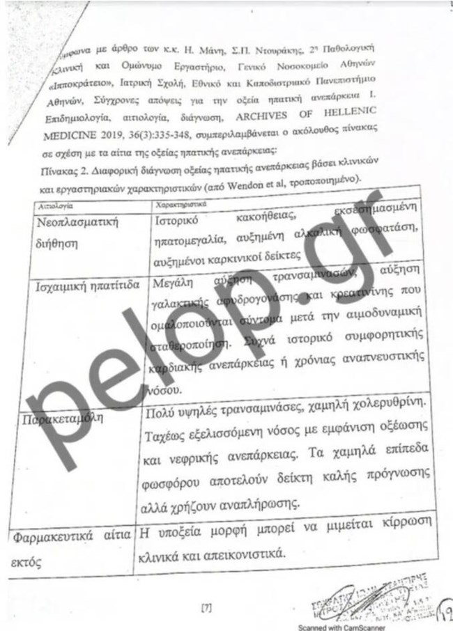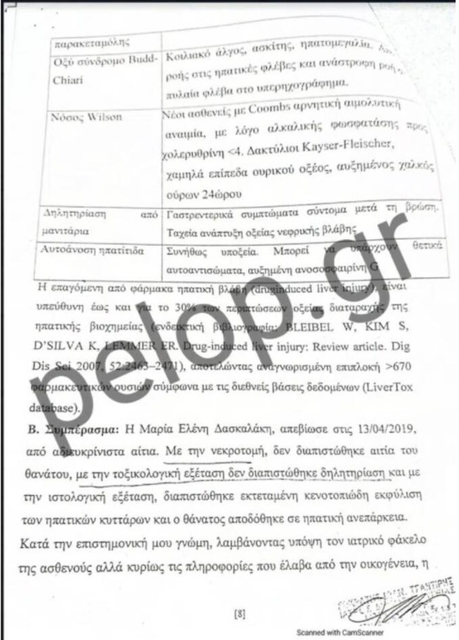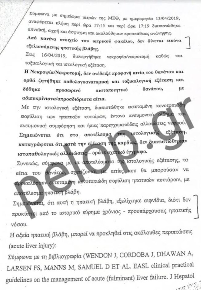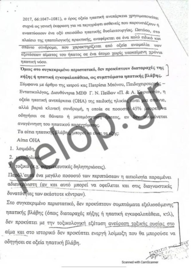 Ο πραγματογνώμονας αναφέρει σε άλλο σημείο του πορίσματός του, ότι με βάση τα στοιχεία που τέθηκαν στην διάθεσή του, ο θάνατος του παιδιού σχετίζεται με αιτίες που περιγράφονται παραπάνω. Σημειώνει δε, ότι αυτή η ηπατική βλάβη εξελίχθηκε αιφνίδια, διότι δεν προκύπτει από το ιστορικό εύρημα χρόνια – προϋπάρχουσα ηπατική νόσος. Επίσης, σημειώνεται ότι στο αποτέλεσμα της ιστολογικής εξέτασης καταγράφεται ότι κατά την εξέταση της καρδιάς δεν διαπιστώθηκαν ιστοπαθολογικές αλλοιώσεις ορατές στο σχετικό έγγραφο.