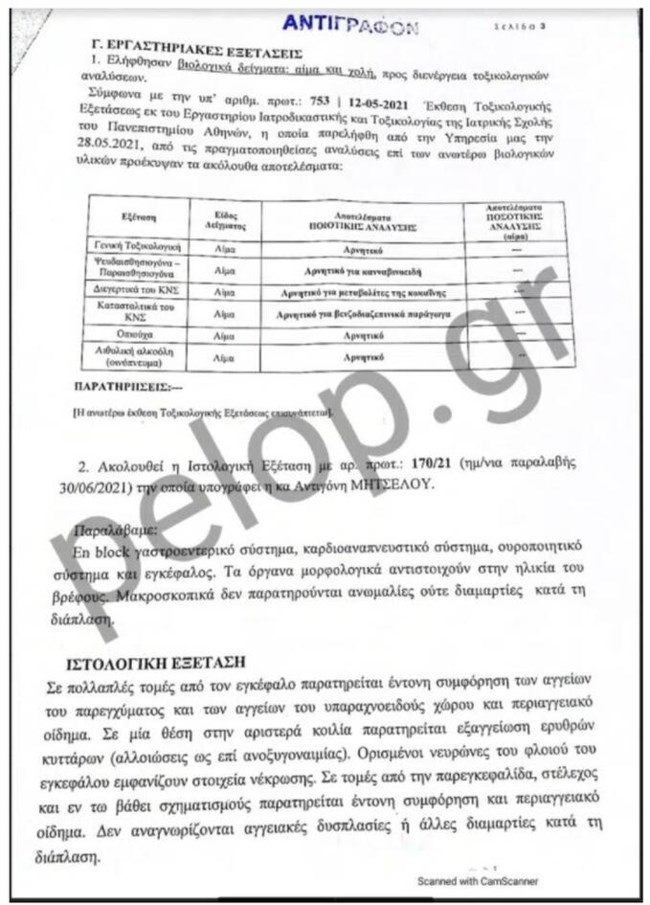 Στο πόρισμα αναφέρεται ότι εξωτερικά στο σώμα δεν βρέθηκαν κακώσεις. Επίσης, κακώσεις δεν βρέθηκαν στο κεφάλι, ούτε και σε άλλα σημεία όργανα του σώματος κατά την νεκροτομή που ακολούθησε. Η τραχεία ήταν ελεύθερη χωρίς την παρουσία ξένου σώματος, ενώ στους πνεύμονες εντοπίστηκε εικόνα πνευμονικού οιδήματος. Στην καρδιά δεν παρατηρήθηκαν ισχαιμικές ή αθηροσκληρυντικές αλλοιώσεις. Οι δε εργαστηριακές εξετάσεις, ήταν όλες αρνητικές σε τοξικές και άλλες ουσίες.