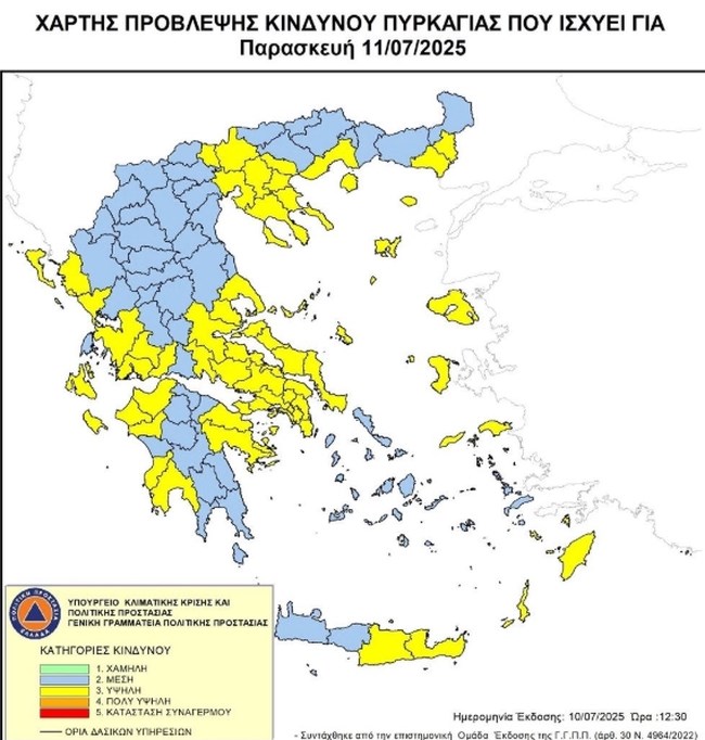 Υψηλός κίνδυνος πυρκαγιάς (κατηγορία κινδύνου 3) προβλέπεται για σήμερα, Παρασκευή (11/07) σε αρκετές περιοχές της επικράτειας.