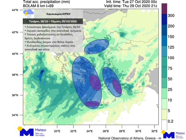 Για την Τετάρτη 28 Οκτωβρίου προβλέπονται βροχές και καταιγίδες, με τοπικά έντονα φαινόμενα σε Πελοπόννησο, Κρήτη, Ανατολική Στερεά, Κυκλάδες, Θεσσαλία, Εύβοια, νησιά Ανατολικού Αιγαίου και μετά το απόγευμα σε Ανατολική Μακεδονία, Θράκη και τα νησιά του Βορείου Αιγαίου, ενώ τοπικές χαλαζοπτώσεις προβλέπονται στις Κυκλάδες, στην Κρήτη, στα Δωδεκάνησα και τοπικά στην Ανατολική Στερεά και στα νησιά του Ανατολικού Αιγαίου. Η ορατότητα τις βραδινές και πρώτες πρωινές ώρες θα είναι κατά τόπους περιορισμένη.