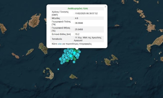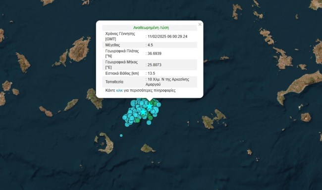 Τουλάχιστον πέντε ακόμα σεισμοί καταγράφτηκαν κατά τη διάρκεια της νύχτας στον θαλάσσιο χώρο νότια της Αμοργού, ο ισχυρότερος από τους οποίους ήταν μεγέθους 5 βαθμών της κλίμακας Ρίχτερ, σύμφωνα με δεδομένα που δόθηκαν στη δημοσιότητα από το Γεωδυναμικό Ινστιτούτο του Εθνικού Αστεροσκοπείου της Αθήνας.