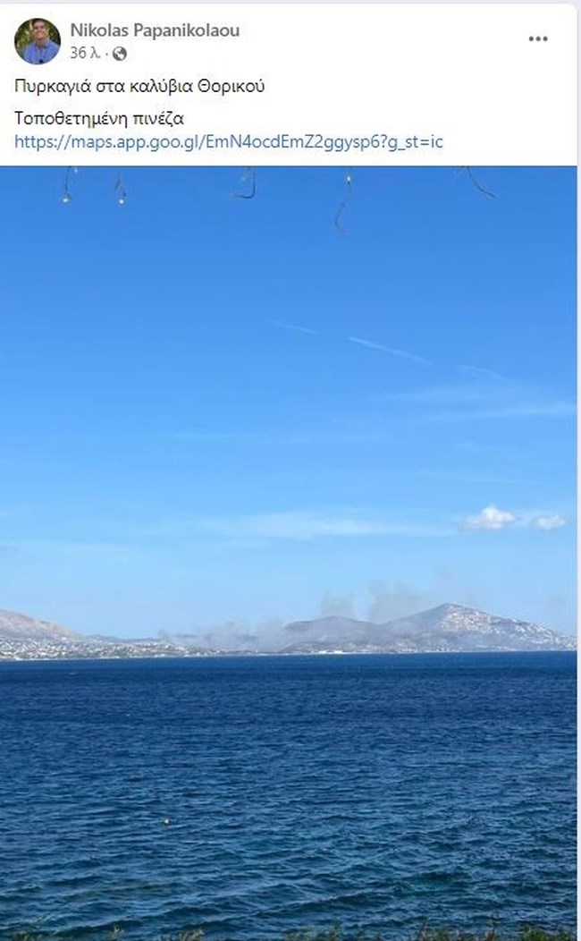 Σύμφωνα με τις πρώτες πληροφορίες, η φωτιά έκαιγε αμπέλια και δημιουργήθηκε μέτωπο λόγω των ισχυρών ανέμων, το οποίο κινείτο προς την παραλία. Σηκώθηκαν δύο αεροσκάφη από την Ελευσίνα και πραγματοποιήθηκαν ρίψεις νερού ένα Ερικσον.