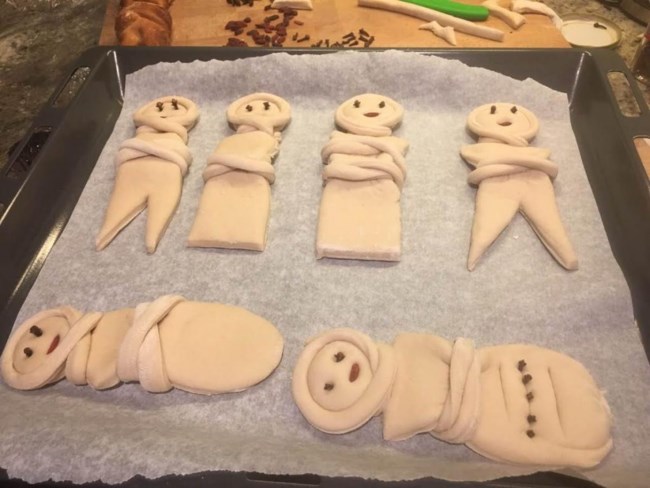 Κόβετε ένα μικρό κομματάκι από το κάθε ζυμαράκι για τα χέρια, το οποίο πλάθετε σε κορδόνι , το υπόλοιπο ζυμαράκι το κάνετε φρατζολάκι και τυλίγετε το κορδόνι σταυρωτά γύρω από τη μέση, τοποθετείτε δύο σταφίδες για τα χεράκια και 2 μοσχοκάρφια για τα μάτια.