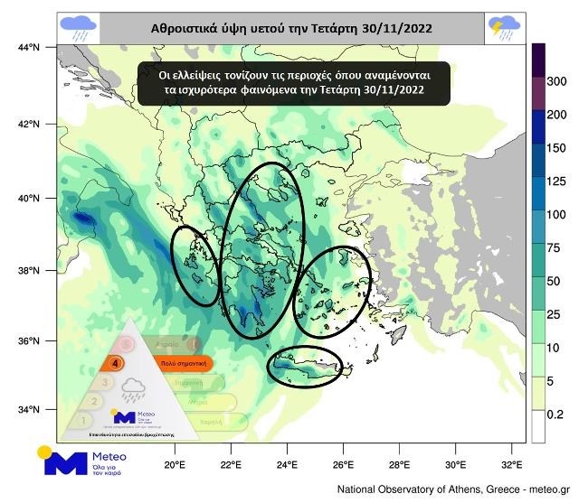 Σημειώνεται ότι τα φαινόμενα την Τετάρτη (30-11-2022) θα είναι κατά τόπους ιδιαίτερα ισχυρά στην κεντρική Μακεδονία (κυρίως νομούς Πιερίας και Χαλκιδικής) και στα βορειοανατολικά τμήματα της Θεσσαλίας.