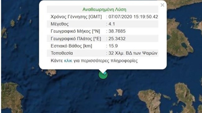 Το επίκεντρο της δόνησης εντοπίζεται στο θαλάσσιο χώρο 32 Χλμ. ΒΔ των Ψαρών.