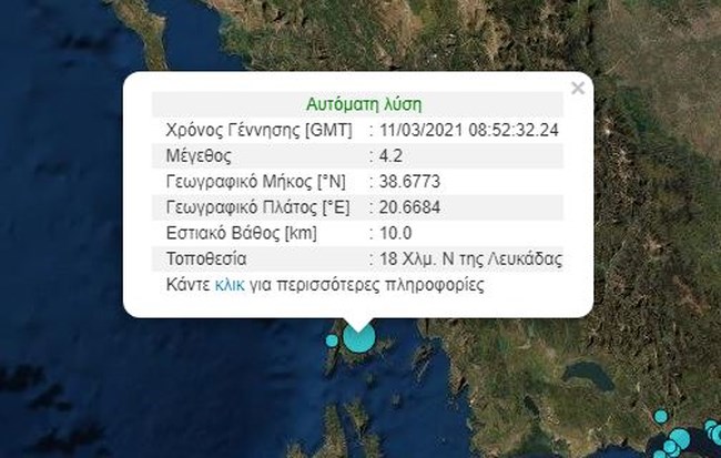 Σύμφωνα με το Γεωδυναμικό Ινστιτούτο, ο σεισμός εντοπίστηκε 18χλμ. νότια της Λευκάδας και είχε εστιακό βάθος 10 χιλιομέτρων.