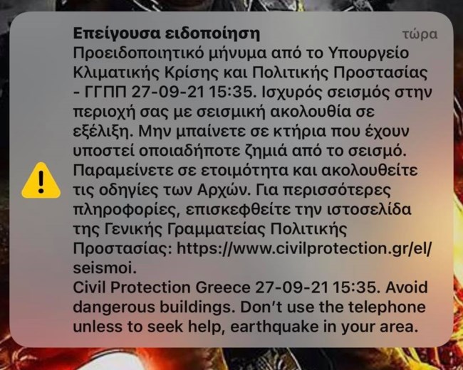 Συγκεκριμένα το προειδοποιητικό μήνυμα αναφέρει: "Ισχυρός σεισμός στην περιοχή σας με σεισμική ακολουθία σε εξέλιξη. Μην μπαίνετε σε κτήρια που έχουν υποστεί οποιαδήποτε ζημιά από το σεισμό. Παραμείνετε σε ετοιμότητα και ακολουθείτε τις οδηγίες των Αρχών.