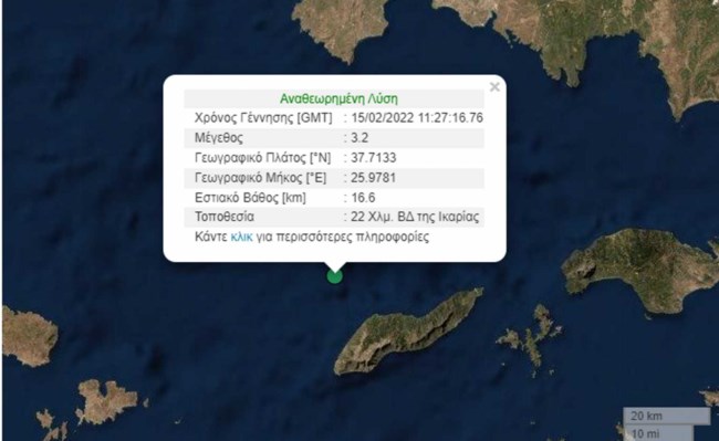 Ο σεισμός στην Ικαρία έγινε συγκεκριμένα στη 1:27′ και είχε μέγεθος 3,2 βαθμούς της κλίμακας Ρίχτερ. Όπως ανακοίνωσε το Γεωδυναμικό Ινστιτούτο, το εστιακό βάθος βρίσκεται στα 16,6 χιλιόμετρα.