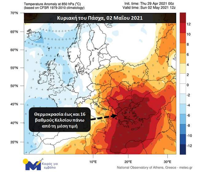 Η θερμοκρασία θα κινηθεί σε υψηλά για την εποχή επίπεδα λόγω των θερμών αερίων μαζών που καλύπτουν την Ανατολική Μεσόγειο. Στον χάρτη που ακολουθεί φαίνεται η απόκλιση τη θερμοκρασίας από τη μέση τιμή της περιόδου 1979-2010 σε ύψος περίπου 1500 μέτρων από το έδαφος. Όπως φαίνεται σε αυτόν, η θερμοκρασία των αερίων μαζών πάνω από τη χώρα μας την Κυριακή του Πάσχα αναμένεται να είναι έως και 16 βαθμούς Κελσίου υψηλότερη από τη μέση τιμή της.