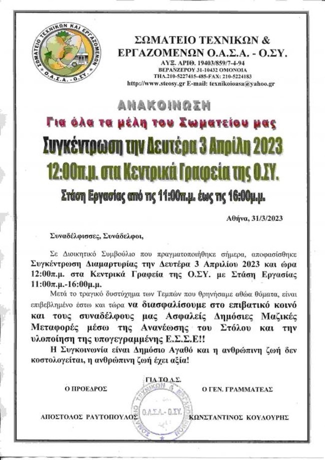 Στάση εργασίας στα λεωφορεία τη Δευτέρα 3 Απριλίου προκύρηξε το Σωματείο Τεχνικών και Εργαζόμενων ΟΑΣΑ-ΟΣΥ.