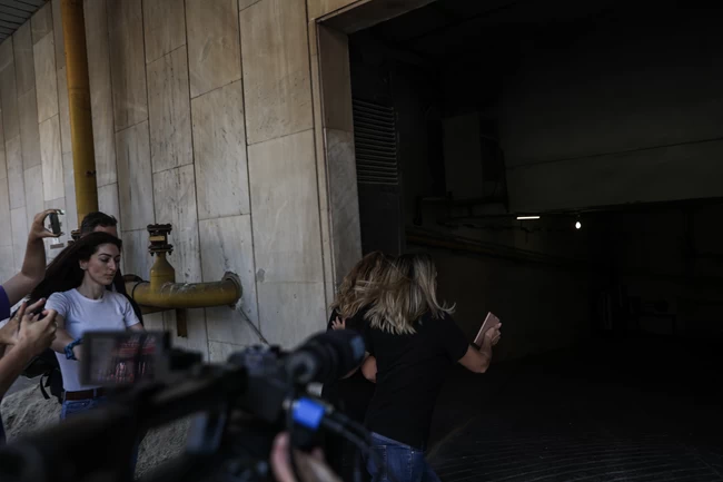 Η Δήμητρα Πισπιρίγκου μπήκε στο κτίριο από την πίσω πόρτα συνοδευόμενη από τον δικηγόρο της αδελφής της, Οθωνα Παπαδόπουλο και αποδοκιμάστηκε από συγκεντρωμένους πολίτες.