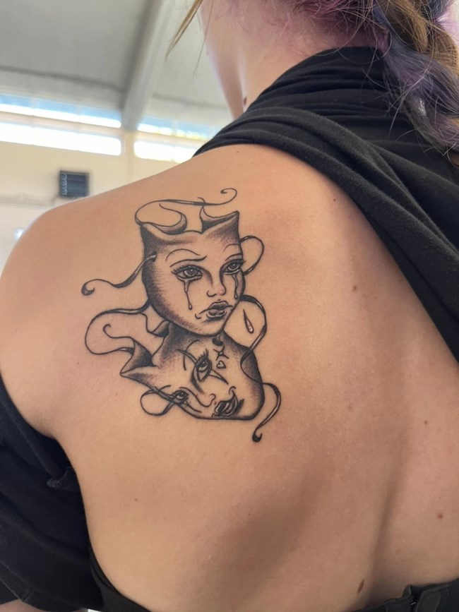 Πίσω από τον έναν ώμο της, η Λήδα Μανθοπούλου έκανε ένα τατουάζ με δύο μάσκες θεάτρου. Στη λεζάντα της ανάρτησής της, έγραψε: