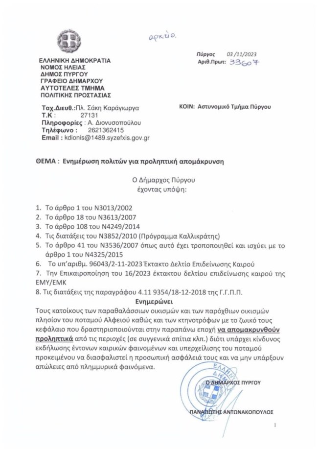 "Ο Δήμαρχος Πύργου ενημερώνει τους κατοίκους των παραθαλάσσιων οικισμών και των παρόχθιων οικισμών πλησίον του ποταμού Αλφειού καθώς και των κτηνοτρόφων με το ζωικό τους κεφάλαιο που δραστηριοποιούνται στην παραπάνω περιοχή να απομακρυνθούν προληπτικά από τις περιοχές (σε συγγενικά σπίτια κλπ) διότι υπάρχει κίνδυνος εκδήλωσης ακραίων καιρικών φαινομένων και υπερχείλισης του ποταμού προκειμένου να διασφαλιστεί η προσωπική ασφάλειά τους και να μην υπάρξουν απώλειας από τα πλημμυρικά φαινόμενα" αναφέρεται σχετικά.