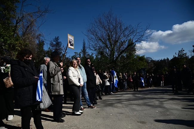 Με σημαίες στα χέρια και κλαδιά ελιάς, πλήθος κόσμου βρέθηκε στο Τατόι περπατώντας στον ανηφορικό, χωμάτινο δρόμο για να αποχαιρετήσουν τον τέως βασιλιά και να βρεθούν κοντά στην βασιλική οικογένεια.