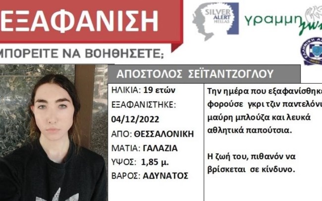 Συναγερμός έχει σημάνει στις αστυνομικές αρχές μετά την εξαφάνιση 19χρονου από τη Θεσσαλονίκη, με τη ζωή του Απόστολου Σεϊταντζόγλου, πιθανόν, να βρίσκεται σε κίνδυνο.