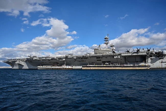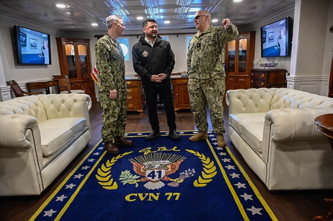 Όπως ανακοινώθηκε, τον υφυπουργό Εθνικής 'Αμυνας υποδέχθηκαν ο διοικητής της Δύναμης Κρούσης 10 (Commander Carrier Strike Group 10) υποναύαρχος Dennis Velez και ο Κυβερνήτης Πλοίαρχος David-Tavis Pollard, οι οποίοι τον ενημέρωσαν τόσο για τις επιχειρησιακές δυνατότητες του αεροπλανοφόρου όσο και για το εύρος των αποστολών που μπορεί να αναλάβει.