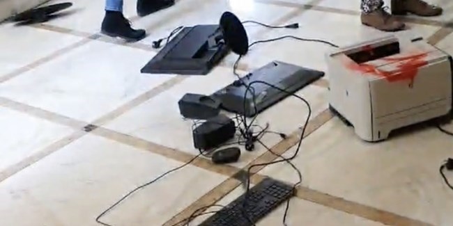 Φορώντας κουκούλες και γάντια, περίπου 20 άτομα εισέβαλλαν στο γραφείο προκαλώντας σοβαρές ζημιές, αντιδρώντας στις κινήσεις κατά των καταλήψεων.