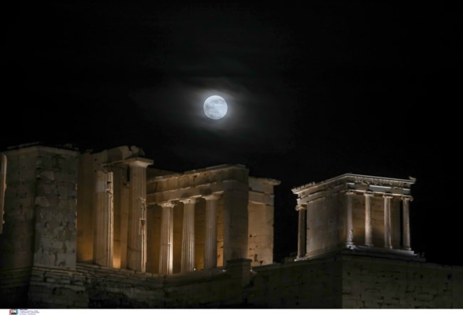 Ο φωτογραφικός φακός των πρακτορείων απαθανάτισε υπέροχες εικόνες από το Σούνιο, τη Θεσσαλονίκη και το Ναύπλιο, φέρνοντας την υπερπανσέληνο σε κάθε οθόνη.