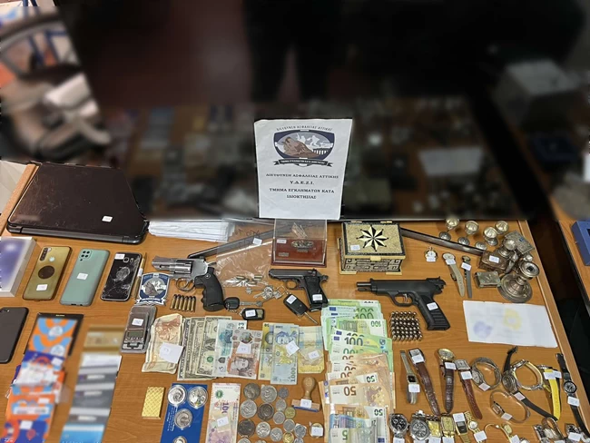 Σε έρευνες που πραγματοποιήθηκαν σε 10 σπίτια και 2 καταστήματα, βρέθηκαν μεταξύ άλλων και κατασχέθηκαν: 4 πιστόλια, 2 περίστροφα, 259 φυσίγγια, συσκευή taser, 2 μαχαίρια, σπαθί, σιδερογροθιά, πλήθος κοσμημάτων, χρυσαφικών και ρολογιών, πλήθος ηλεκτρονικών συσκευών, πλήθος κινητών τηλεφώνων και καρτών sim, πλήθος γυαλιών ηλίου και αρωμάτων, πλήθος διαρρηκτικών εργαλείων, πλήθος κλειδιών διαφόρων τύπων, πλαστική συσκευασία με αναβολικές ουσίες, το χρηματικό ποσό των 8.347 ευρώ και 11 αυτοκίνητα.