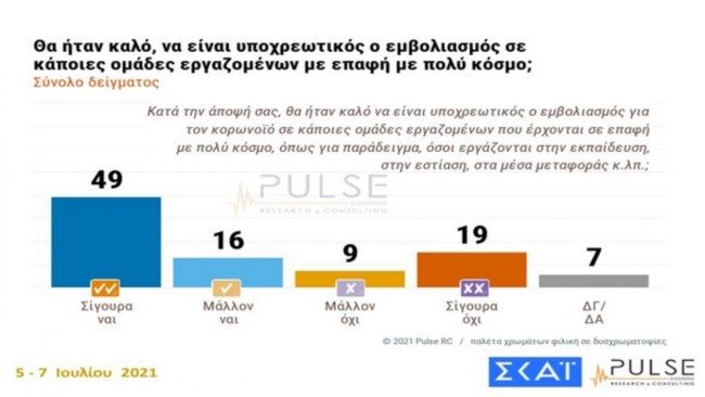 Σύμφωνα με τη δημοσκόπηση της Pulse για λογαριασμό του ΣΚΑΪ, υπέρ του υποχρεωτικού εμβολιασμού κατά του κορονοϊού τάσσεται το 65% των Ελλήνων για ομάδες εργαζόμενων που έρχονται σε επαφή με πολύ κόσμο, όπως στην εκπαίδευση, την εστίαση και τα μέσα μαζικής μεταφοράς.