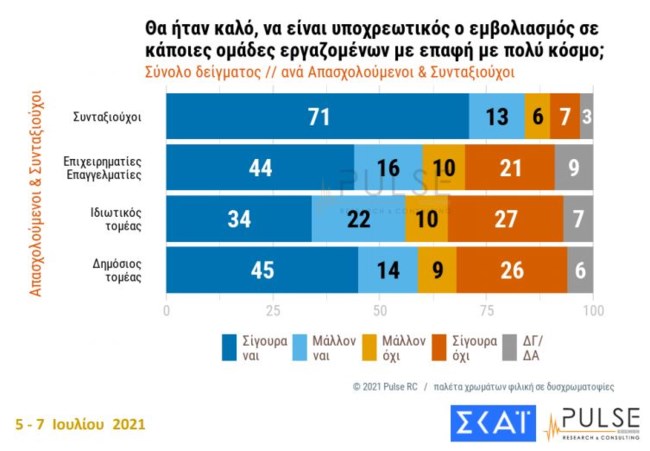 Περαιτέρω, υπέρ της υποχρεωτικότητας του εμβολιασμού τίθενται με συντριπτική πλειοψηφία (71%) οι συνταξιούχοι, ακολουθούν οι εργαζόμενοι στον δημόσιο τομέα σε ποσοτό 45%, οι επιχειρηματίες με 44% και ο ιδιωτικός τομέας με 34%.
