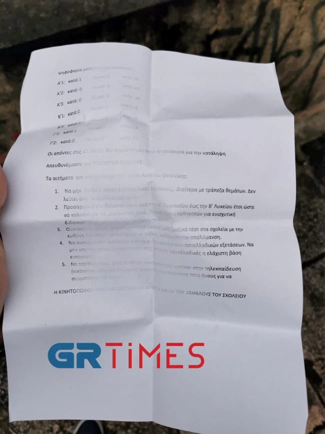 Συγκεκριμένα αναφέρει ότι "επειδή διαπιστώσαμε ότι το σχολείο είναι υπό κατάληψη, τα μαθήματα σήμερα θα πραγματοποιηθούν διαδικτυακά με τη συνήθη ώρα έναρξης (8 π.μ.). Επομένως ενημερώστε τα παιδιά σας να παραμείνουν στο σπίτι για να συμμετάσχουν στην εξ αποστάσεως διδασκαλία".