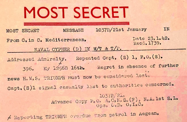 Από εκεί και μετά τα ίχνη του Τriumph εξαφανίζονται και στις 23 Γενάρη 1942 το Βρετανικό Ναυαρχείο αναφέρει σε ναυτικό σήμα ότι το υποβρύχιο Triumph πρέπει να θεωρείται απολεσθέν μετά από περιπολία στο Αιγαίο.
