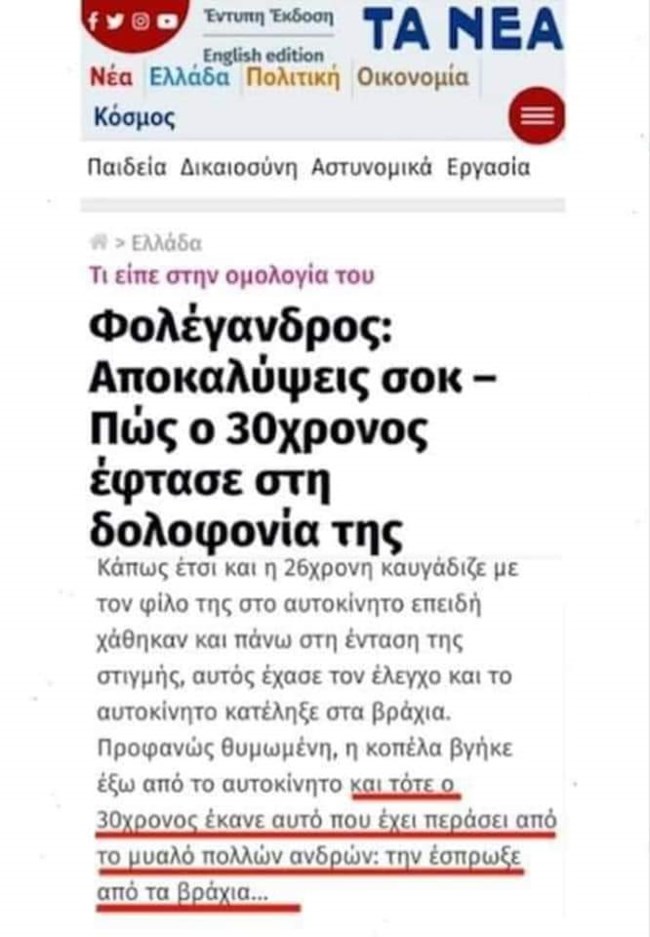 Η σύνταξη της ηλεκτρονικής έκδοσης της εφημερίδας ΤΑ ΝΕΑ ζήτησε συγνώμη για μια απαράδεκτη φράση που γράφτηκε σε σχέση με τη δολοφονία της Γαρυφαλλιάς στη Φολέγανδρο. Συγκεκριμένα, ο συντάκτης του ρεπορτάζ για τη γυναικοκτονία στη Φολέγανδρο έγραψε ότι "θυμωμένη, η κοπέλα βγήκε έξω από το αυτοκίνητο και τότε ο 30χρονος έκανε αυτό που έχει περάσει από το μυαλό πολλών ανδρών: την έσπρωξε από τα βράχια…"
