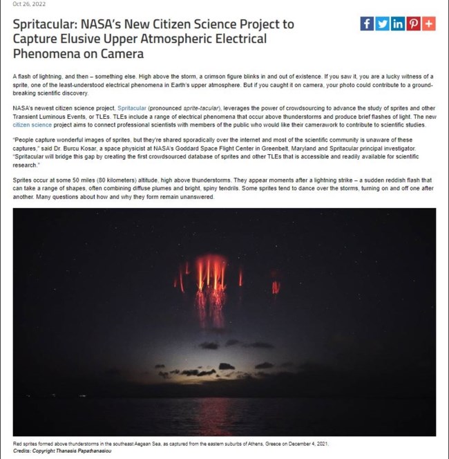 "Μία ευχάριστη έκπληξη με περίμενε σήμερα το πρωί καθώς από τη NASA επέλεξαν μία από τις φωτογραφίες μου με Red Sprites για την ανακοίνωση του νέου Citizen Science Project με ονομασία "Spritacular"" έγραφε ο 42χρονος στις 27 Οκτωβρίου στο προφίλ του στο Facebook κοινοποιώντας την ανάρτηση της NASA με τη λήψη του.