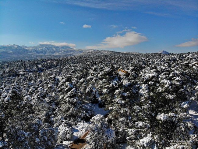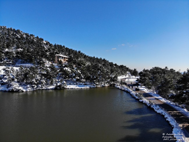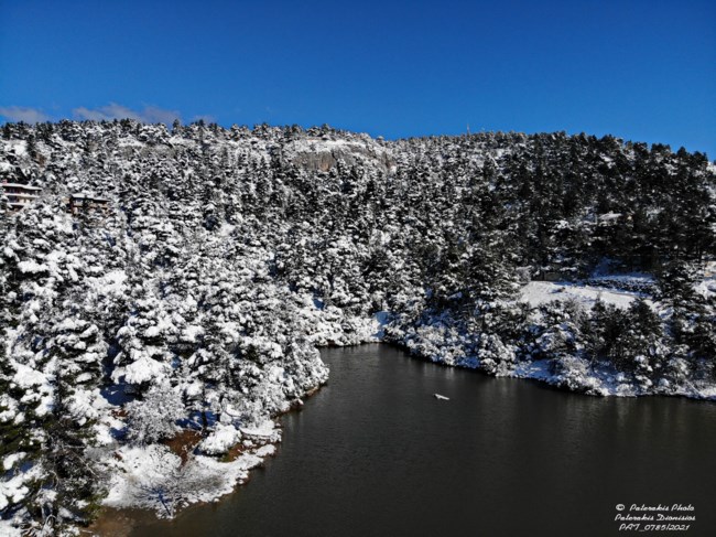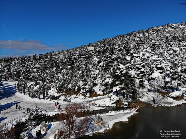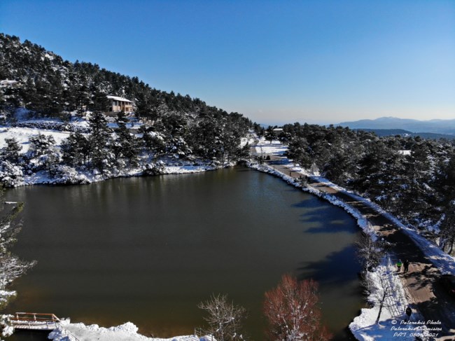 Η λίμνη περιβάλλεται από ένα πευκόδασος, ενω στις όχθες υπάρχουν και πλατάνια. Τα δέντρα... πασπαλίστηκαν από το χιόνι που έπεσε στην περιοχή το Σάββατο και οι εικόνες θυμίζουν πίνακα ζωγραφικής.