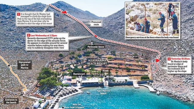 Στο νησί της Σύμης μετέβη χθες Κυριακή ιατροδικαστής, και σύμφωνα με τις πρώτες πληροφορίες, φαίνεται να αποκλείει την εγκληματική ενέργεια. Οι ίδιες πληροφορίες αναφέρουν ότι ο ιατροδικαστής δεν μπορεί να διαπιστώσει τα αιτία θανάτου μακροσκοπικά, ούτε αν ο Μόσλεϊ έπεσε από τα βράχια, καθώς το πτώμα είναι σε προχωρημένη σήψη.