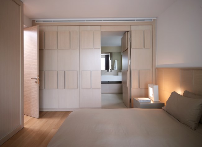 Όλα τα σταθερά έπιπλα του διαμερίσματος, από τα κομμάτια της κουζίνας και του μπάνιου έως τις ντουλάπες σε κάθε δωμάτιο, σχεδιάστηκαν ειδικά για το σπίτι. Αφενός μεν οι tailor-made λύσεις αναδεικνύουν καλύτερα το χώρο, αφετέρου εξασφαλίζουν την οπτική αρμονία. Τα υλικά που χρησιμοποιήθηκαν είναι το ξύλο δρυός και το ζεμπράνο, δηλαδή το ριγέ ξύλο, τα οποία πέρασαν από επεξεργασία με χρώμα στο βερνίκι τους για να πάρουν μια φιλική μπεζ απόχρωση.