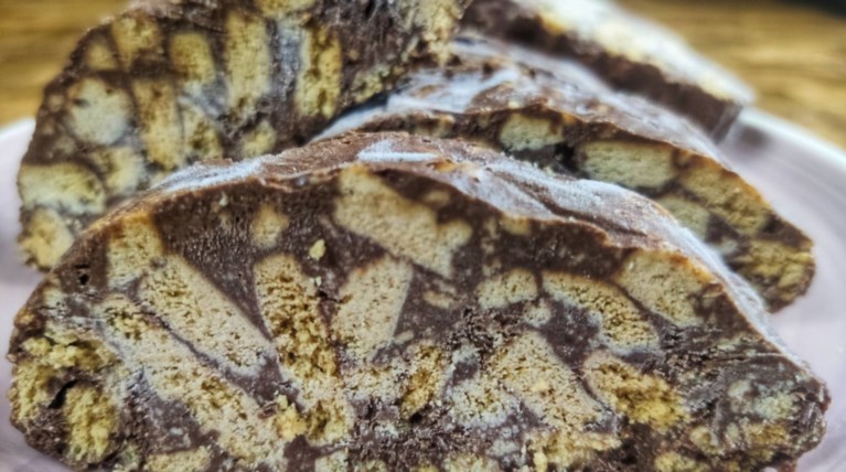 Σε ένα άλλο μπολ τρίψτε τα μπισκότα με τα χέρια. Ανακατέψτε με το μείγμα σοκολάτας και δείτε αν χρειάζεται και άλλα μπισκότα. Αν όχι μεταφέρετε σε ένα κομμάτι αντικολλητικό χαρτί και τυλίξτε.