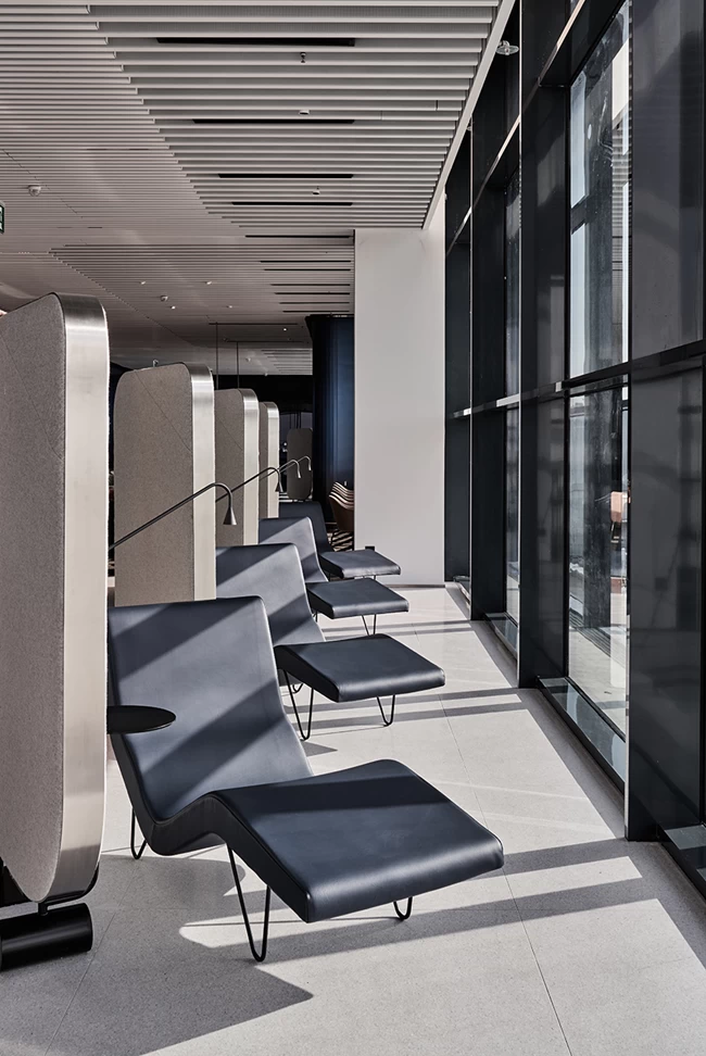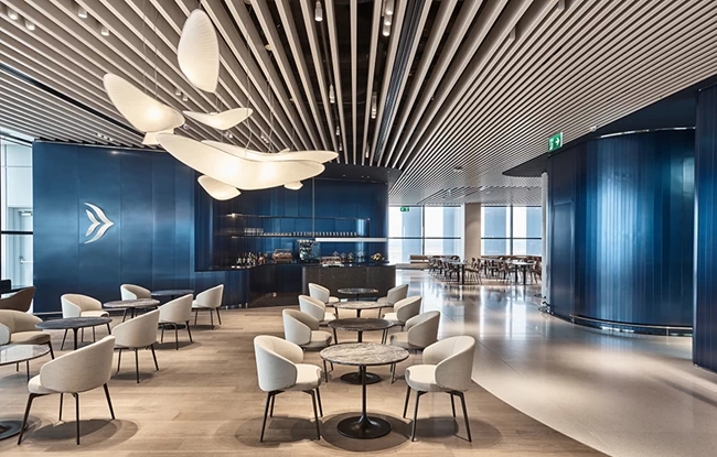 Το φυσικό φως και η εντυπωσιακή θέα στους διαδρόμους προσγείωσης και απογείωσης του αεροδρομίου σε συνδυασμό με τα υλικά υψηλής ποιότητας όπως το μάρμαρο, το μωσαϊκό, το γυαλί και το ξύλο δημιουργούν ένα σύγχρονο και μοντέρνο χώρο. Η κεντρική αίθουσα, το media lounge, ο ειδικά διαμορφωμένος χώρος για περισσότερη ιδιωτικότητα και χαλάρωση, τα privée meeting rooms, τα δυο καφέ καθώς και το μεγάλο εστιατόριο σε συνδυασμό με το wine bar δημιουργούν νέα και διαφορετικά σημεία συνάντησης προσφέροντας πολλές επιλογές για κάθε επιβάτη ανάλογα με τις ανάγκες του. Επιπλέον, επιδιώκοντας η παραμονή στο Lounge να λειτουργήσει και ως πλατφόρμα προβολής της ελληνικότητας οι γεύσεις και οι επιλογές ζεστών, κρύων εδεσμάτων και κρασιών προέρχονται κυρίως από εκλεκτούς Έλληνες παραγωγούς.