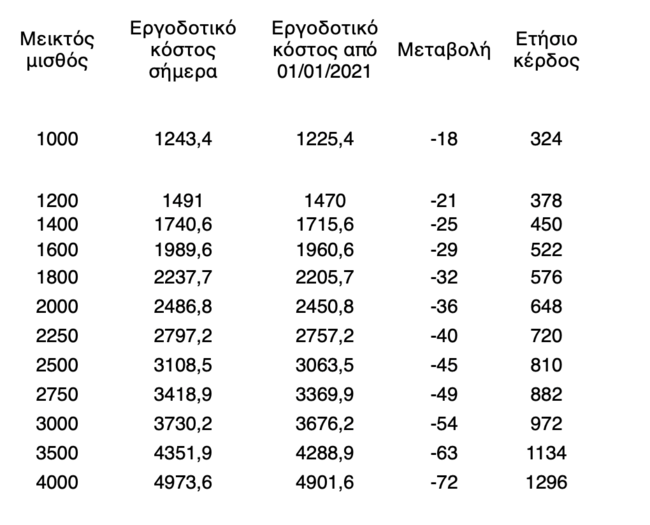 Αντίστοιχα, το όφελος για τον εργοδότη ανάλογα με το ύψος των μεικτών μηνιαίων αποδοχών, αποτυπώνεται στον ακόλουθο πίνακα: