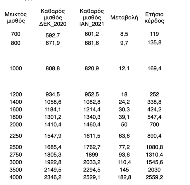 Αυξήσεις στις καθαρές αποδοχές τους οι οποίες ξεκινούν από τα 8,5 ευρώ τον μήνα ή τα 119 ευρώ τον χρόνο για κάποιον που αμείβεται με 700 ευρώ και φτάνουν μέχρι και τα 183 ευρώ τον μήνα ή 2559 ευρώ τον χρόνο για ένα υψηλόβαθμο στέλεχος με αποδοχές της τάξεως των 4000 ευρώ τον μήνα μεικτά θα λάβουν οι εργαζόμενοι πλήρους απασχόλησης στον ιδιωτικό τομέα με την αλλαγή του χρόνου.