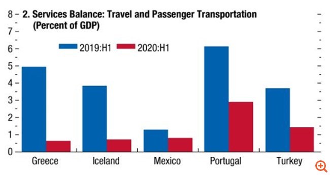 Τα καθαρά έσοδα από τον τουρισμό και τις μεταφορές στην Ελλάδα από περίπου 5% του ΑΕΠ το α΄εξάμηνο του 2019 υποχώρησαν κάθετα στο 0,6% του ΑΕΠ το πρώτο εξάμηνο του 2020, υπολογίζει το ΔΝΤ, εκτιμώντας ότι πρόκειται για την πιο μεγάλη πτώση ως αναλογία του ΑΕΠ ανάμεσα στις "εκτεθειμένες" στους εν λόγω κλάδους χώρες τις οποίες εξετάζει, δηλαδή την Πορτογαλία, τη Τουρκία, την Ισλανδία και το Μεξικό.