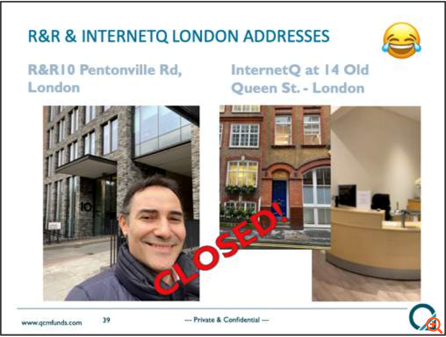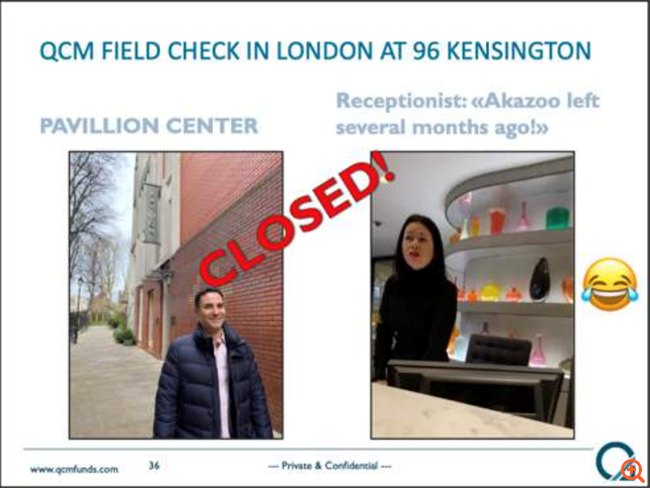 Η QCM παρατηρεί επίσης πως η Akazoo έχει κλείσει τα περισσότερα (ίσως και όλα) τα γραφεία της εκτός Ελλάδας, συμπεριλαμβανομένων των κεντρικών της γραφείων στο Λονδίνο. Ο Γκάμπριελ Γκρέγκο επισκέφτηκε τα γραφεία στο Λονδίνο στο Pavillon Center και στο νούμερο 96 της Kensington High Street, και όπως διαπίστωσε η Akazoo έχει φύγει εδώ και πολύ καιρό. Αυτή είναι η διεύθυνση που δηλώνει η εταιρεία τόσο στο σάιτ της όσο και στην Επιτροπή Κεφαλαιαγοράς των ΗΠΑ ως κεντρική.