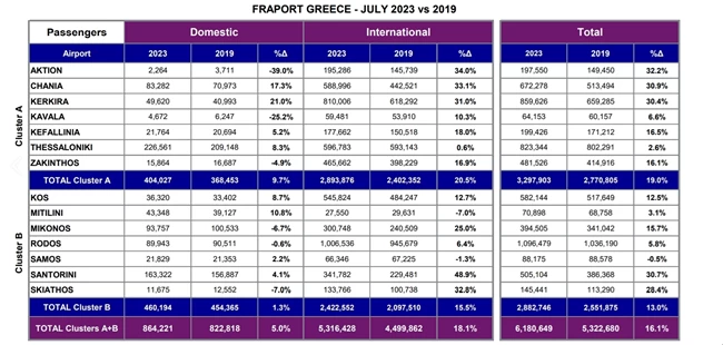 Ειδικότερα, η επιβατική κίνηση το Ιούλιο έφτασε τα 6,18 εκατομμύρια, σημειώνοντας άνοδο κατά 4,5% σε σύγκριση με τον Ιούλιο του 2022 (5,91 εκατομμύρια επιβάτες), υψηλότερα και από τον Ιούλιο του 2019 (5,32 εκατομμύρια επιβάτες).